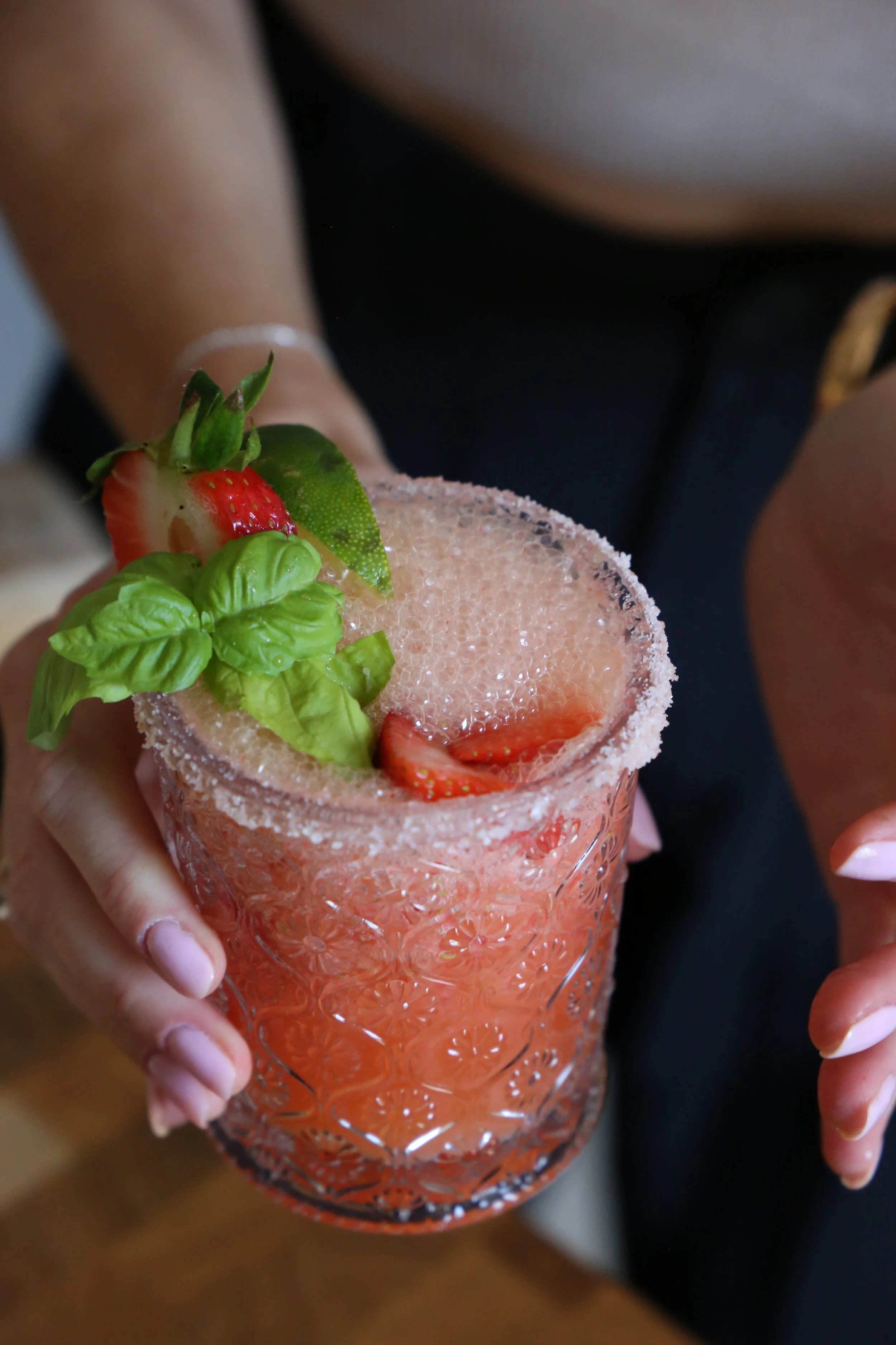 Top as you wish with strawberry slices, lime slices or herbs like basil / mint for visual.