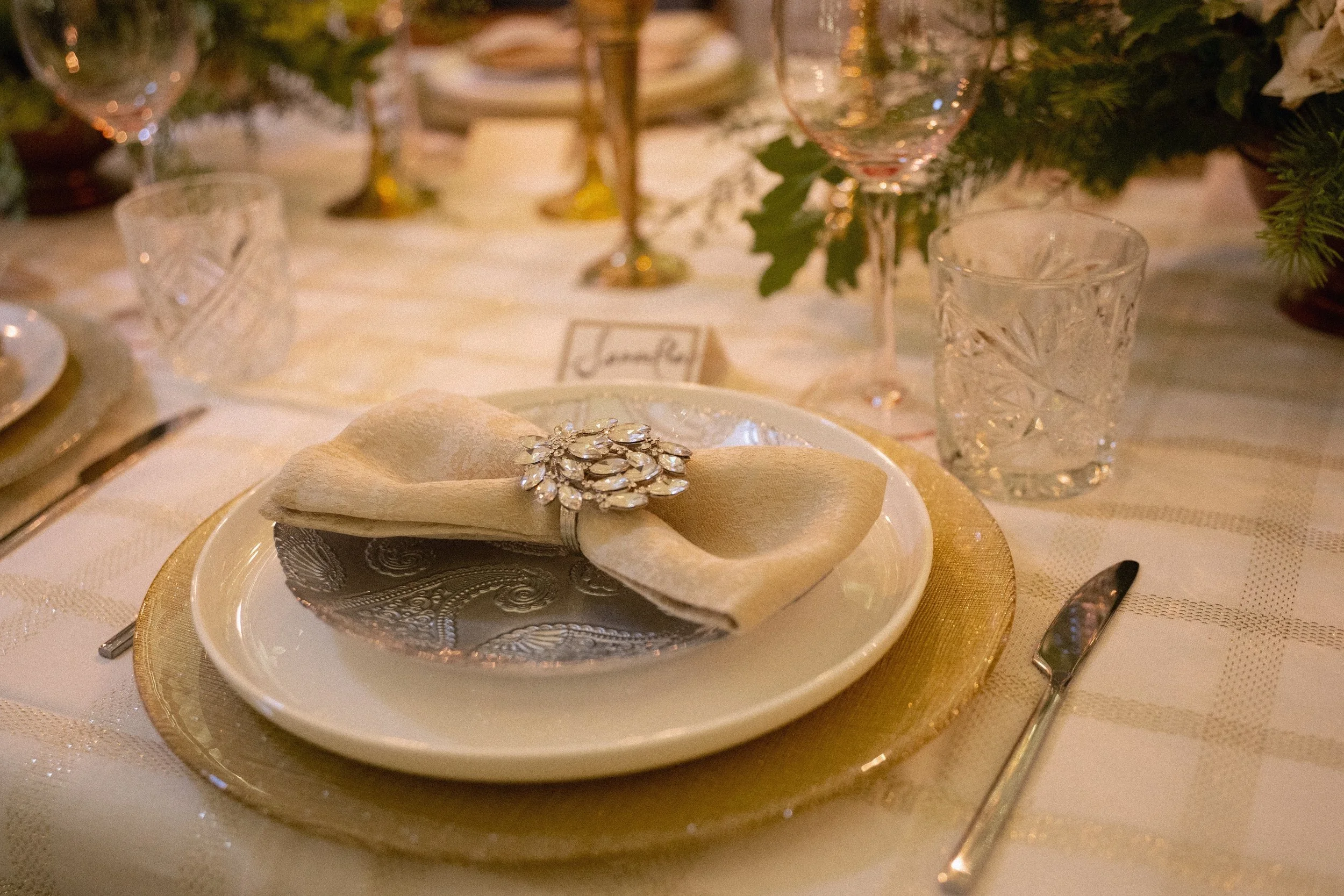 When it comes to table decor, I love including lots of greenery! Ask your florist to additionally incorporate some touches of white to compliment the white/gold tablescape of the holidays. I worked with Bloom & Co florist in Niagara-on-the-lake for our holiday engagement dinner and her work was incredible. Check her out!
